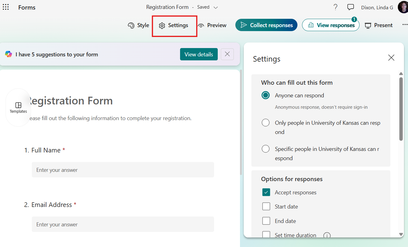 - If creating new form, provide a title, select Save, and go to the Settings [down arrow] menu at top-right and select Settings to specify options.