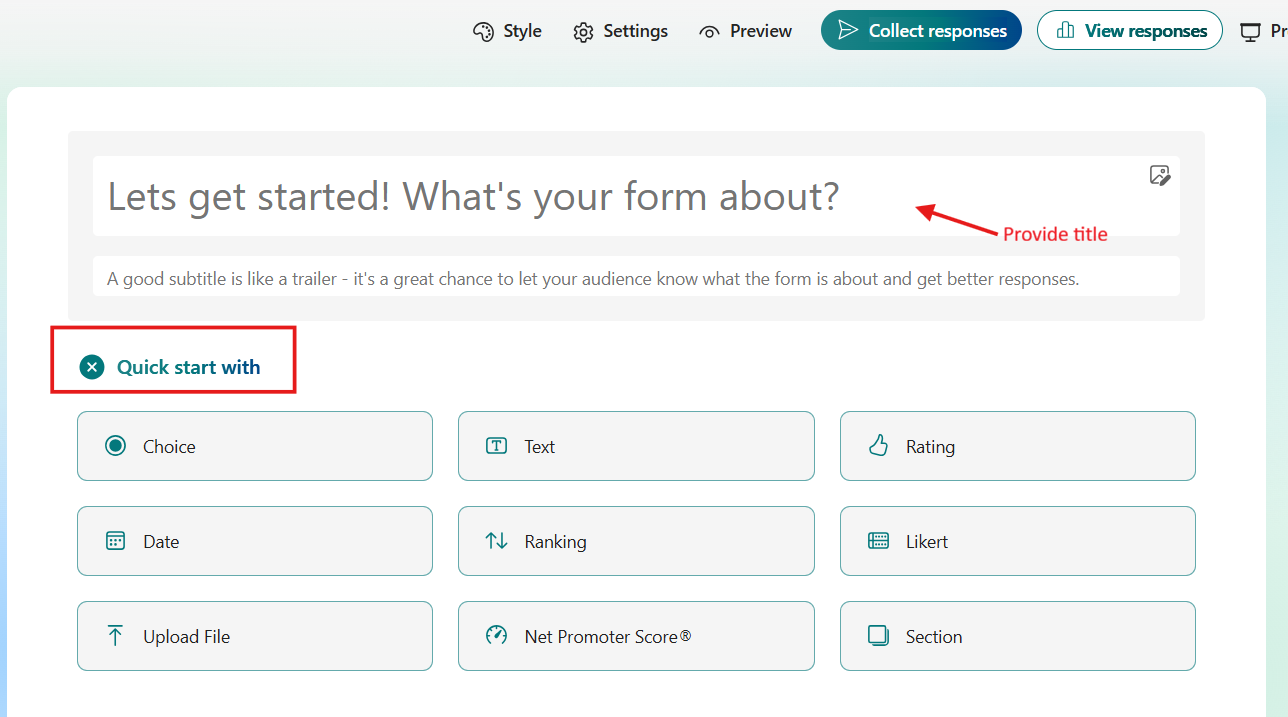 - Provide a title, then select Quick start with to choose the type of question you want to ask.