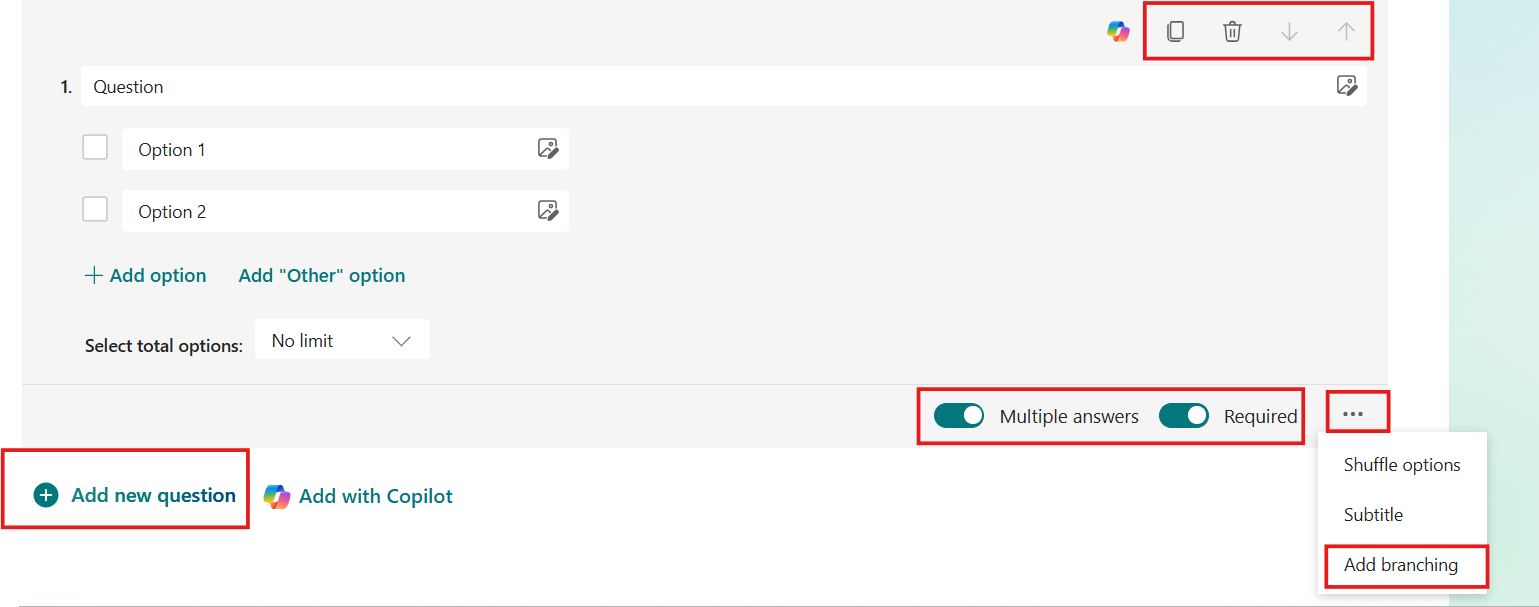 View ScreenshotSelect the 3 dots at the bottom-right of a question, then select Add branching. - Choose Add Branching.