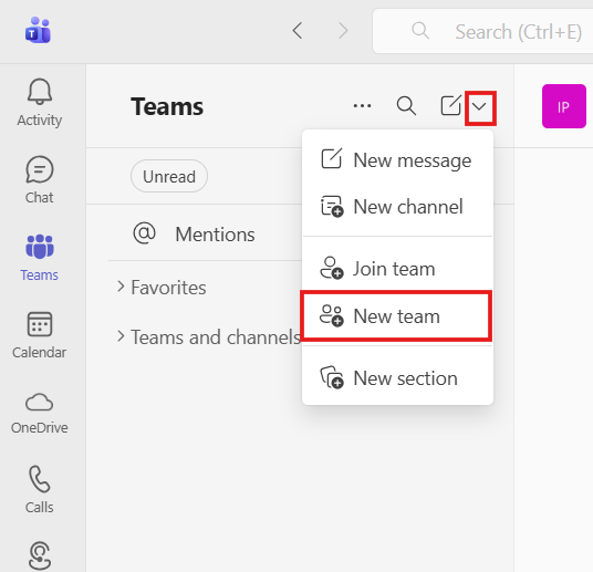 Once your in Teams, the Create a new team option will be located in different places, depending on which layout you are using.